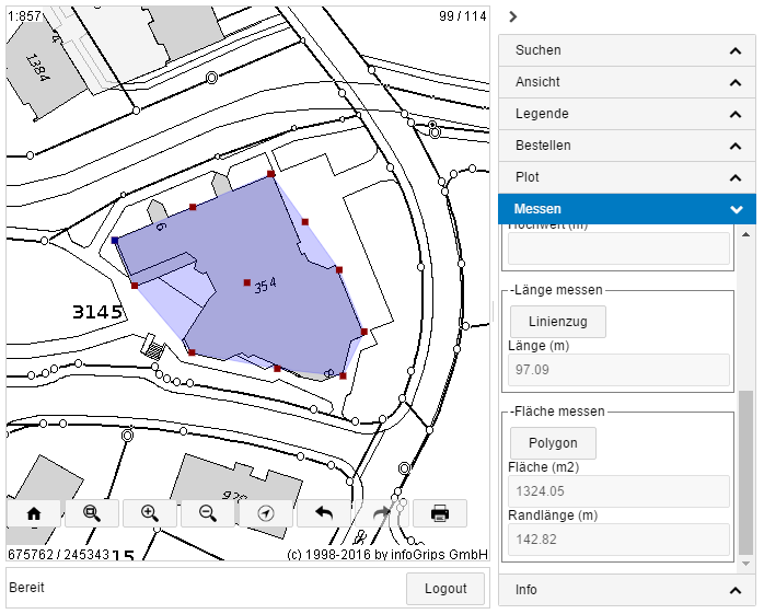 Von einem mittels Datenpunkten definierten Polygon wird die Fläche in m2 angezeigt.